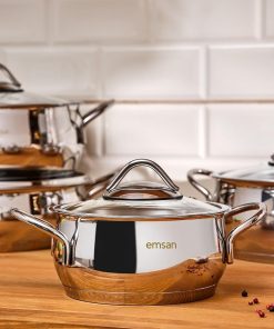 Emsan Cemre İndüksiyon Tabanlı 8 Parça Çelik Tencere Seti, 304 kalite Emsan çeliğiyle üretilen Cemre serisinin bir parçasıdır. Bu seride çelik tencerelerin dayanıklılığı ve kullanışlılığı, şık tasarım detaylarıyla buluşur. Yuvarlak hatlı paslanmaz çelik gövdesi, ergonomik sapları ve cam kapaklı şık tasarımıyla göz doldurur. Isıyı uzun süre tencere içinde hapseden enerji kapsül tabanı, düşük ısılarda bile mükemmel pişirme sonuçları sunar. Cemre serisi ürünler 2 yıl garantilidir ve yedek parça temini yapılmaktadır, bu da uzun ömürlü kullanım sağlar.