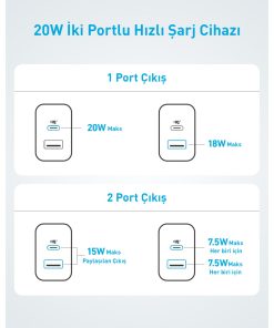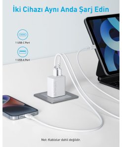 Anker 20W USB-C + USB-A Çift Portlu Şarj Cihazı – A2348 – Beyaz (Anker Türkiye Garantili)