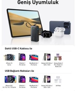 Dahili USB-C kablosunu kullanarak akıllı telefonlarınızı, tabletlerinizi ve dizüstü bilgisayarlarınızı şarj edin ve aynı zamanda şarj cihazının kendisini de şarj edin – tüm şarj ihtiyaçlarınızı karşılar!