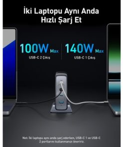 Aynı anda iki laptopu güçlendirin, USB-C 1 portu 140W ve USB-C 2 portu 100W sağlar.