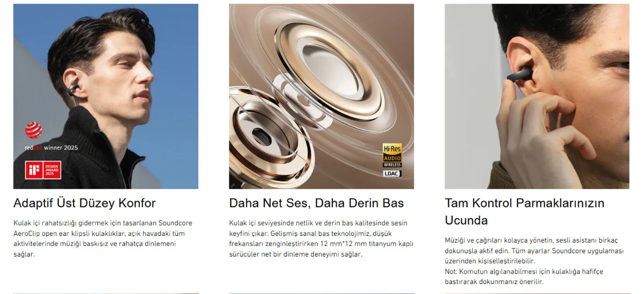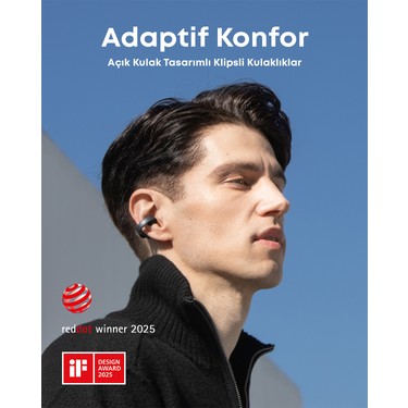 Soundcore AeroClip klipsli kulaklıklar, 20.000 kez bükülmeye dayanıklı adaptif açık halka tasarımıyla öne çıkar. Hafif ve esnek yapısıyla gün boyu sabit kalır ve güvenli kullanım sunar.