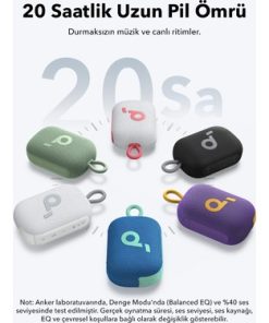 Not: Pil ömrü, hoparlörün varsayılan ayarları, %50 ses seviyesi ve dengeli ekolayzır (EQ) kullanılarak Anker Laboratuvarı'nda test edilmiştir. Gerçek oynatma süresi; ses seviyesi, ses kaynağı ve çevresel koşullara bağlı olarak değişiklik gösterebilir.