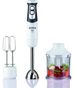 El Blender Seti Beyaz çift bıçaklı doğrayıcı kabı ve paslanmaz çelik çırpma telleri kısa sürede lezzetli yemekler yapmanıza olanak tanıyor.