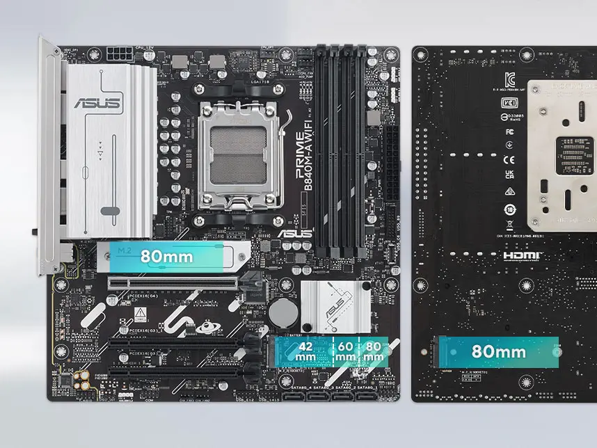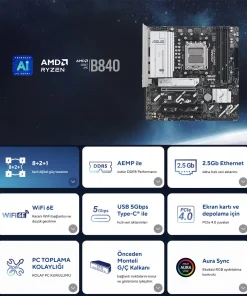prıme b840m-a wıfı, iki tanesi pcıe 4.0 üzerinden 64 gbps’e varan veri aktarım hızlarını, bir tanesi ise pcıe 3.0 hızları destekleyen toplamda üç adet m.2 yuvasına sahip. bu, işletim sistemi ya da uygulama sürücülerinin açılışını hızlandırır.