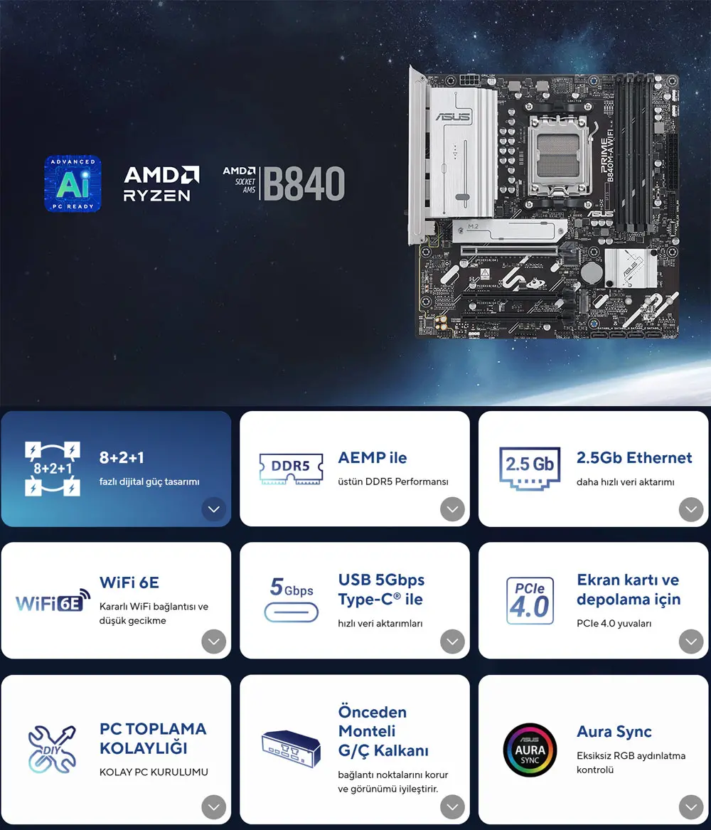 Asus prime serisi anakartlar, amd ryzen™ 9000 serisi işlemcilerin tüm potansiyelini ortaya çıkarmak için ustalıkla geliştirildi. prıme b840m-a wıfı günlük kullanıcılara ve kendi pc’lerini toplayan kişilere kullanışlı yazılımlar ve özelliklerle çeşitli performans optimizasyonları sunar. gelişmiş yapay zeka bilgisayarları için tasarlanan ürün, zorlayıcı yapay zeka uygulamalarına yönelik güç ve bağlantı özellikleriyle donatıldı.