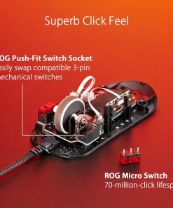 - Üstün tıklama hissi: ROG Mikro Anahtarlar, tutarlı tıklama kuvveti ve 70 milyon tıklama ömrü sunuyor.