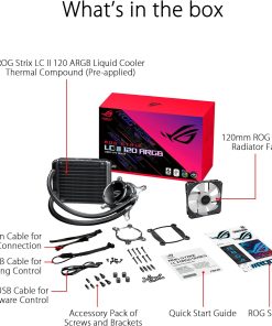 ROG STRIX LC II 120 ARGB ROG Strix LC II 120 ARGB hepsi bir arada CPU soğutucusu, Intel® LGA1700/1200/1150/1151/1152/1155/1156/2011/2011-3/2066 ve AMD AM4/TR4 desteği, Aura Sync ve bir adet ROG 120 mm adreslenebilir RGB özellikli radyatör fanı 7.Nesil Astek pompa, 840 rpm’den başlayan çalışma aralığıyla olağanüstü soğutma ve minimum gürültü sağlar. En uygun hava akışını ve statik basıncı oluşturan ROG tasarımı fan. NCVM kaplama pompa kapağında ve radyatör fanındaki ayrı ayrı adreslenebilir RGB aydınlatma ile şık ve modern tasarım. Sisteminizin en iyi biçimde görünmesi için ROG anakartları mükemmel tamamlayan estetik görünüm Daha yüksek dayanıklılık için sağlamlaştırılan ve sarılan tüpler ROG STRIX LC II 120 ARGB