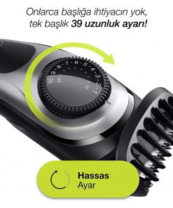Braun BT 5265 Saç & Sakal Şekillendirici, AutoSense Teknoloji, Siyah&Gri, Kablosuz Islak&Kuru,+ Gillette Hediye Stiliniz için zahmetsiz hassasiyet. En üstün hassasiyet için 39 uzunluk ve ömür boyu keskin bıçaklar 2 kırpma tarağı ve hassas kadran tüm sakal ve saç stilleri için 0,5 mm ile 20 mm arasında 39 uzunluk ayarı sunar. Ömür boyu keskin bıçakları ve Mini folyo tıraş makinesi aksesuarıyla Braun Sakal Kırpma Makinesi en üstün hassasiyeti garanti eder. Kit, sinekkaydı tıraş için plus free Gillette Fusion5 ProGlide tıraş makinesi içerir. Braun’un Sakal Kırpma Makineleri Almanya’da tasarlanmıştır. Kirli, kısa sakal ve saç kırpma Kısa sakal tarağı kısa ila orta uzunluktaki sakalları (0,5 – 10mm) korumanıza yardımcı olur ve saçınızı keser. Daha yakın (0,5 mm) tıraş için tarağı çıkarın. Hassas kadran 0,5 mm'lik adımlar halinde tam olarak istenen uzunluğu elde etmenizi sağlar. Uzun sakal ve saç kırpma 11 – 20mm tarakla daha uzun sakal ve saç stillerini koruyun. Hassas kadran 0,5 mm'lik adımlar halinde tam olarak istenen uzunluğu elde etmenizi sağlar. Dış hatları düzgünleştirme Boyunda ve yanaklarda keskin çizgiler ve kenarlar etmek için sakal kırpma makinesini kullanmak için tarağı çıkarın. Sinekkaydı ve Hassas tıraş Flexball Teknolojisine sahip free Gillette Fusion5 ProGlide tıraş makinesiyle boynu, yanakları ve yüzü sinekkaydı tıraş edin. Küçük alanlar için mini folyo tıraş makinesi aksesuarını da kullanabilirsiniz. Ömür boyu keskin bıçaklar ve autosensing motor Braun’un autosensing motoru sık dolaşık saçlarda bile sabit hız sağlar. Ömür boyu keskin bıçaklara sahip olan tıraş makinesi ilk vuruşta kusursuz sonuç elde etmenize yardımcı olur. Çekme ve çekiştirme yok. Daha uzun ömürlü lityum iyon pil 100 dakika kırpma. 1 saat içinde tam şarj. Bir kırpma için 5 dakikalık hızlı şarj. Tam yıkanabilir cihaz Kolay temizleme için musluk suyu altında güvenli bir şekilde tutun. LED pil ve şarj göstergesi LED pil ve şarj göstergesiyle asla rastlantıyla şarjınız bitmez.