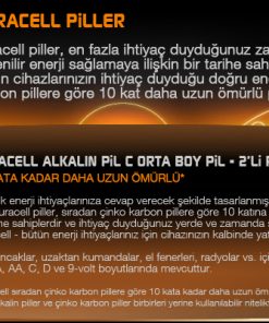 Duracell Basic C piller, biraz ek güç gerektiren günlük cihazlara güvenilir şekilde güç sağlamak için ideal çok amaçlı alkalin pillerdir. Duracell alkalin piller, AA, AAA, C, D ve 9V boylarında sunulmaktadır. Duralock teknolojisi, normal koşullarda saklandıklarında kullanılmamış Duracell pilleri 10 yıla kadar yeni ve dolu tutar. Bu piller, size güvenebileceğiniz bir ürün sağlayarak, cihazlarınızdan keyif alma özgürlüğü verir. Duracell piller, motorlu oyuncaklar, piller, taşınabilir oyun konsolları, uzaktan kumandalar, CD oynatıcılar vb günlük cihazlarınızda güvenilir, uzun ömürlü güç istediğinizde ideal çözümlerdir.