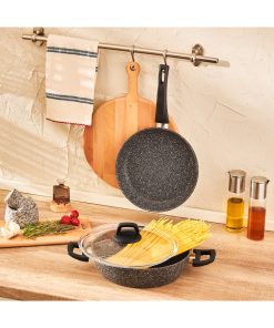 Emsan Luna 3 Parça Tencere Tava Seti Malzeme: Granit Kaplama Set İçeriği 26 cm Pilav Tenceresi 26 cm Tava 1 Adet Cam Kapak Özellikler Tek kapak tüm set ile uyumludur. Bulaşık makinesinde yıkamaya uygundur. İndüksiyon hariç tüm ocaklar için uygundur. Gövde kalınlığı: 3.4 mm
