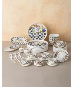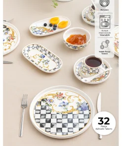 Bu takım, 6 kişilik ideal bir kahvaltı veya servis setidir. 32 parçadan oluşur; tabaklar, kupalar, servis ve sunum tabakları gibi çeşitli öğeleri içerir. Her bir parça, yüksek kaliteli porselenden üretilmiş olup, uzun süreli kullanım için dayanıklılık sunar.