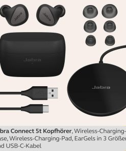 - Teslimat kapsamı: 1 x Jabra Connect 5t kablosuz kulaklık, Qi sertifikalı şarj kabı, kablosuz şarj pedi, 3 farklı boyutta kulak jelleri, USB-C kablosu, kulaklık ağırlığı: 5 g / 0,176 oz, titanyum/siyah
