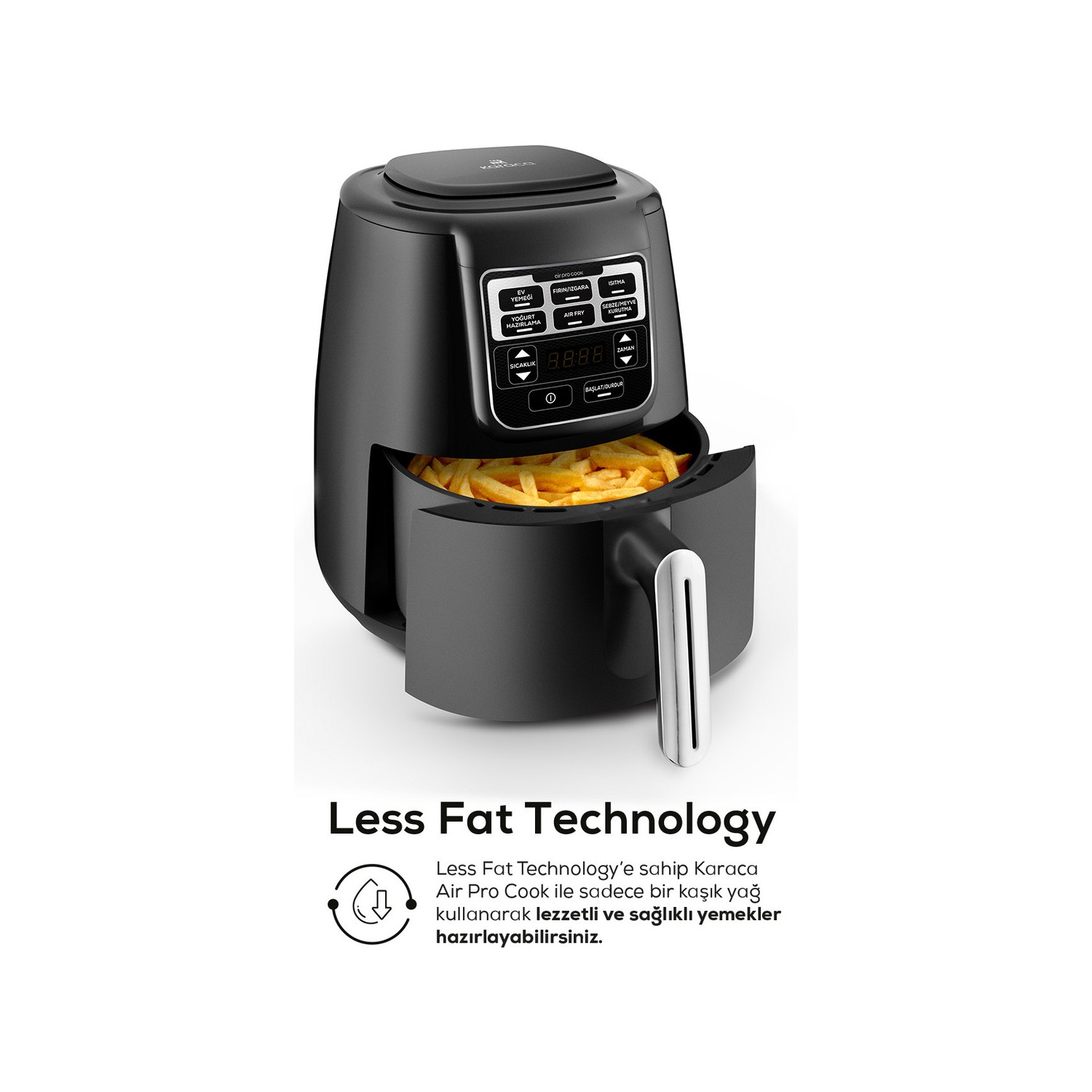 Hem lezzetli hem sağlıklı beslenmek isteyenlere, Air Pro Cook. Sağlıklı kızartmalar, ev yoğurdu, sebze-meyve kurutma, fırın ve ızgara lezzetlerinin yanı sıra sulu yemek de yapabilen Karaca Air Pro Cook, tüm lezzetleri Less Fat Technology ile sadece bir kaşık yağ kullanarak hazırlar.