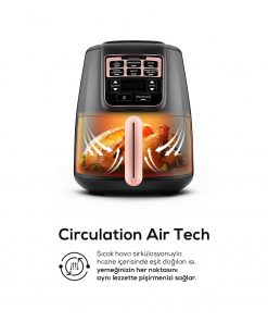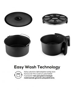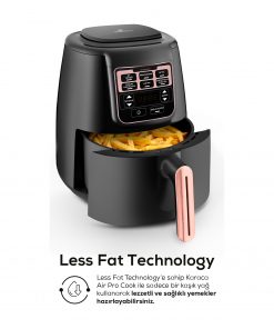 Karaca Air Pro Cook XL 2 in 1 Konuşan Airfryer RosegoldHem lezzetli hem sağlıklı beslenmek isteyenlere, Air Pro Cook. Sağlıklı kızartmalar, ev yoğurdu, sebze-meyve kurutma, fırın ve ızgara lezzetlerinin yanı sıra sulu yemek de yapabilen Karaca Air Pro Cook, tüm lezzetleri Less Fat Technology ile sadece bir kaşık yağ kullanarak hazırlar. Her aşamada sizi konuşarak bilgilendiren Air Pro Cook, 4 litre geniş hacmiyle tabak tabak lezzetleri sizinle buluşturur. Circulation Air Tech’in yukarıdan aşağıya hareket eden sıcak hava akımı teknolojisi ile yemeğinizin her noktasını eşit kıvamda pişirir. Yemeklerinizi yeniden ısıtmak istediğinizdeyse ısıtma özelliğini kullanabilirsiniz. Bulaşık makinesinde yıkanmasını sağlayan Easy Wash Tech ile enerjinizi temizliğe değil, yepyeni tarifler keşfetmeye ayırabilirsiniz.