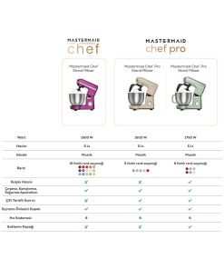 Matermaid Chef Pro 1500W motor gücü ile ideal çırpma, karıştırma ve yoğurma işlemlerini kolaylıkla gerçekleştirir. Zero Side Tech Özel geliştirilmiş çift kollu aparatı, hamur kancası, balon çırpıcı ve düz karıştırıcı ile ters yönde tam tur dönerek kasede gıda kalıntısı bırakmaz ve daha homojen karışımlar elde etmenizi sağlar. 6 kademeli hız ayarı ve ek pulse fonksiyonu vardır. Özel tasarım çırpma teli kasenin her yerine ulaşır, en küçük porsiyonları bile rahatlıkla karıştırabilirsiniz. Hamur kancası ile ekmek, makarna, börek gibi tüm hamur işleriniz için istediğiniz miktar ve kıvamda hamuru yoğurarak mükemmel sonuçlar elde edebilirsiniz. Düz karıştırıcı aparatı ile püre, krep gibi karışımları en ideal kıvamda hazırlayabilirsiniz. Hamur yoğurma ve karıştırma aparatları özel kaplamaları sayesinde yapışmaz ve kolay temizlenebilir. Tek hareketle açılabilen oynar başlıklı üst gövde ve güçlü tutucu ayaklar sayesinde hamur maksimum seviyede karışırken bile gövde stabil kalır. 4 farklı renk seçeneği ile Mastermaid Stand Mikser her renkte dekore edilmiş mutfağa uyum sağlar. Aparatları bulaşık makinesinde yıkanabilir.