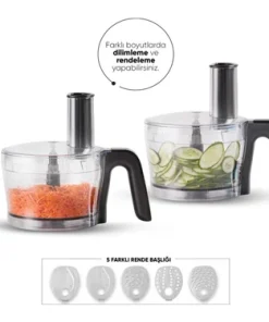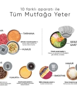 - 10 farklı aparatı ile doğrama, karıştırma, öğütme, rendeleme, dilimleme, yoğurma ve çırpma fonksiyonlarının hepsini bir arada sunar.