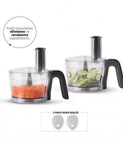 2000W motor gücü ile en iyi ve en hızlı gıda işleme performansını sağlar 1500 ml lik geniş hazneli ile 1,5 kg domatesi tek seferde çekebilirsiniz. Çift katlı, 4 kanatlı doğrayıcı bıçakları üstün doğrama performansı sağlar. Böylelikle humus, salça, kıyma ve tarhana gibi yiyeceklerinizi hızlıca hazırlayabilirsiniz. 2 farklı paslanmaz çelik rende başlığı ile meyve, sebze ve sert peynirleri farklı şekillerde dilim ve rendeleyebilirsiniz Hamur yoğurma aparatı ile kısa sürede homojen hamurlar elde edebilirsiniz. Kaydırmaz ayakları sayesinde çalışma esnasında gövde stabil kalır. Aparatları bulaşık makinesinde yıkanabilir ve pratik şekilde sökülüp takılabilir.