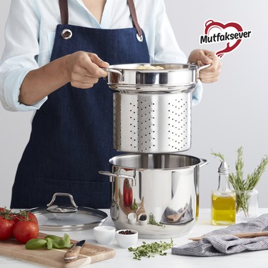- Derin haşlama süzgeci, tenceresi ve kapağı ile 3 parçadan oluşur.