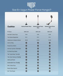 - Vantuz Power Force özel geliştirilmiş 2000 mAh Lityum iyon batarya teknolojisi ile 45 dakika boyunca kesintisiz süpürür.