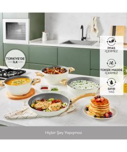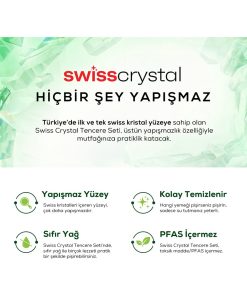 - PFAS ve Zararlı Kimyasallar İçermez: Swiss kristallerden oluşan yapışmaz yüzeyi; insan sağlığını tehlikeye sokan “PFAS” gibi zararlı kimyasal maddeler içermez.