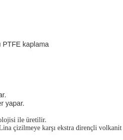 - geri dönüşümlü, tamamen doğal malzemeden, çevre dostu teknoloji ile üretilen lina çizilmeye karşı ekstra dirençli volkanit görünümlü ptfe kaplama ve yüksek ısıya dayanıklı silikon dış kaplama ile çok az yağ kullanarak lezzetli yemekler yapar.