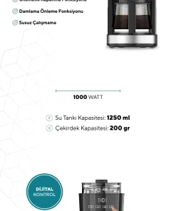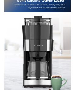 Kapasite: Tek seferde 10 fincana (1250 ml) kadar kahve demleme kapasitesi