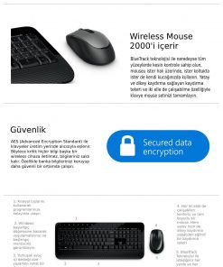 Parmaklarınızın ucundaki şifreleme ve rahatlıkStandart klavyelerin aksine, bu klavye, tuş vuruşlarınızı şifreleyerek kişisel ve işle ilgili bilgilerinizi korumanıza yardımcı olmak üzere tasarlanmış olan Gelişmiş Şifreleme Standardı (AES) sunar. Klasik tasarıma sahip klavyenin ve elinizi destekleyip rahat etmenizi sağlayan yastık dokulu avuç desteğinin keyfini sürün. Masaüstü geliştirilmiş yan tutma yerleri, dört yönlü kaydırma ve Blue Track teknolojisi sunan kablosuz, tam boyutlu bir fareyle tamamlanmıştır. Bu klavye yalnızca güvenli, rahat ve kullanışlı olmakla kalmaz, aynı zamanda kolayca kullanıma hazır hale gelir; alıcı vericiyi takın ve kullanmaya başlayın!