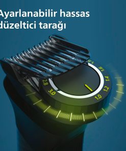 Ayarlanabilir hassas düzeltici tarağı sayesinde 5 kat daha keskin* hatlar yaratarak tarzınızı mükemmelleştirebilirsiniz. BeardSense teknolojisi kıl kökünü algılayarak yoğunluğuna göre bir kesme performansı sağlar; böylece kişiselleştirilmiş bir deneyim sunar. Kendiliğinden bilenen çelik bıçaklar yağlamaya gerek kalmadan ilk günkü keskinliğini korur. Yüz, Saç ve Vücut için kullanılan çok amaçlı başlıkları sayesinde tepeden tırnağa tüm bakım ihtiyacınızı karşılar. Hem ıslak hem kuru kullanılabilir ayrıca tüm başlıkları musluk altında yıkayabilirsiniz. 1 saat şarj 120 dk performans + 5 dk’lık hızlı şarj opsiyonu