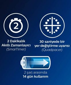 Dişlerinizi iyice fırçalamak yalnızca 2 dakikanızı alır. QuadPacer ağzınızın her bölgesini yeterince temizlediğinizi size bildirirken, SmarTimer özelliği sayesinde 2 dakikalık süre bitiminde durur. Bu iki işlev, her zaman önerilen diş fırçalama süresine ulaşmanıza yardımcı olur.