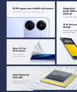 POCO C65, akıcı ve göz yormayan 6,74 inçlik 90 Hz ekranıyla görsel deneyimi üst seviyeye taşıyor. 50 MP yapay zeka destekli üçlü arka kamera sistemi, keskin ve detaylı fotoğraflar çekmenizi sağlarken, 18 W hızlı şarj desteğiyle kullanımınızı kesintisiz tutuyor. 5 dakikalık şarjla 5 saate kadar müzik keyfi sunan bu cihaz, MediaTek Helio G85 işlemcisi ve 5000 mAh bataryasıyla güçlü performans sergiliyor. MIUI 14 ile POCO'nun sunduğu özel deneyim, kullanıcılarına modern bir arayüz ve akıcı bir işlevsellik sağlıyor. Çift SIM+microSD desteği, çoklu işlevselliği artırırken, yapay zeka destekli yüz tanıma özelliği de güvenliği artırıyor. Type-C bağlantı noktası ve çoklu NFC gibi özellikler, kullanıcıların bağlantı ve veri transferi ihtiyaçlarını karşılıyor