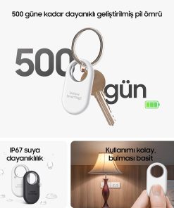 Kolay tarafından bakın. Yeniden tasarlanan Galaxy SmartTag2, kolayca kullanılan ve taşınan, IP67 toza ve suya dayanıklılık derecesiyle de dayanıklı bir yapıya sahiptir. Nesnelerin İnterneti cihazlarınıza uzaktan erişim sağlar ve 500 güne kadar, hatta Güç Tasarrufu Modunda %40’a kadar daha fazla süreyle hayatta kalır.
