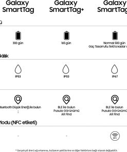- Asla kaybetmeyin. 500 güne kadar dayanıklı geliştirilmiş pil ömrü, IP67 toza ve suya dayanıklılık derecesi, aradığınızı kolay bulmanızı sağlayan Pusula Görünümü ve Yakınlarda Ara özellikleriyle Galaxy SmartTag2, değerli eşyalarınızı kaybetmemenizi ve basit bir tıklamayla çeşitli Nesnelerin İnterneti cihazlarını kontrol etmenizi sağlar.