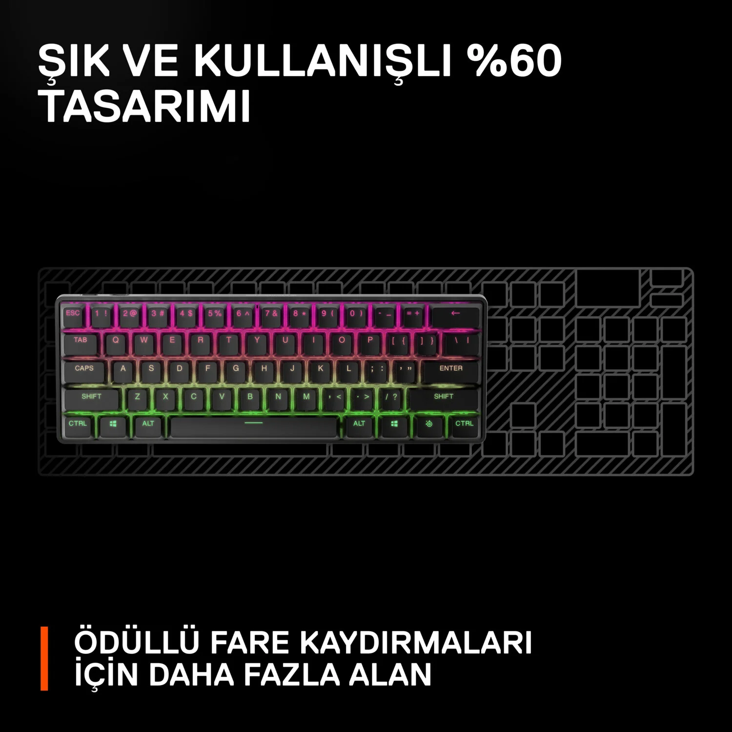 Apex Pro Mini, yandan baskılı ikincil işlevleriyle tam boyutlu bir klavyenin tüm özelliklerini korurken, oyun kazandıran fare kaydırmaları için masanızda daha fazla alan yaratmak üzere tasarlanmıştır.